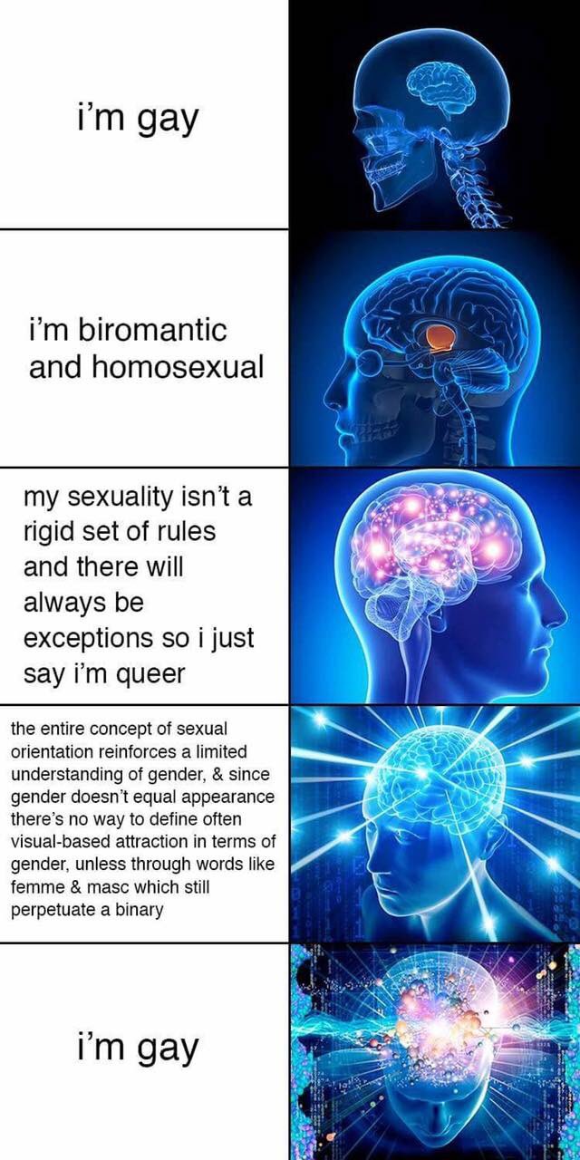 It’s not a coincidence that a frequent target of this meme is the academization of discourse around gender and sexuality. It’s a sort of hero’s journey through language and the mind, from an initial unmooring from the way we have been raised and trained see the world, through a dizzying array of ways of thinking about it that can be useful, clarifying, and/or nonsensical, and finally back again, transformed and capable of changing the world. The penultimate brain — the wokest, most byzantine, most self-assured brain — is unable to grapple with this infinite texture, the way many things can be true at once, that any given slab of language is going to grasp at best a piece of the reality.